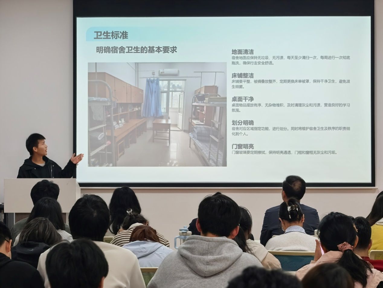 经过前期初筛,共有9间优秀宿舍脱颖而出,入围本次决赛环节。各参赛宿舍代表依次上台,通过PPT与短视频,从多个维度全面展示了宿舍的独特风貌。窗明几净、物品摆放井然有序,体现了同学们良好的生活习惯和安全意识;整体风格或清新雅致,或简约现代,一方方小小天地被赋予了独特的格调与灵魂;宿舍公约、集体照片墙、读书角等细节,充分展现了室友间团结友爱、积极向上的精神风貌;有的宿舍巧手改造旧物,变废为宝,践行环保理念;有的则结合专业特色,将学科元素融入宿舍装饰,创意迭出。